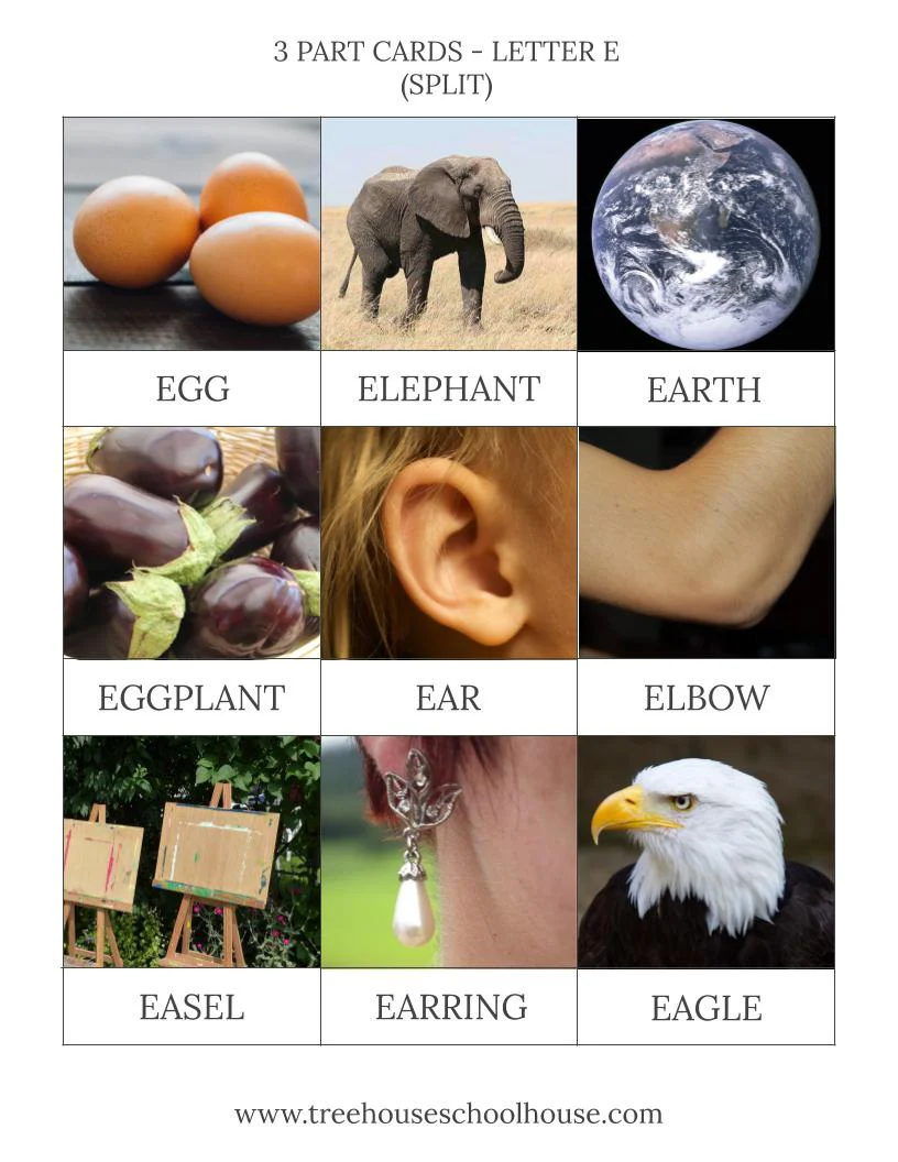 The classic Montessori-style 3-Part Cards. Each word includes a full color, real-life image and the correlating text. Each letter set comes in both the "whole" and "split" versions, so your child can match the world to the image in endless combinations. This set includes a 65-page pdf and over 300 common words from A to Z. I recommend you print the cards on cardstock and laminate.