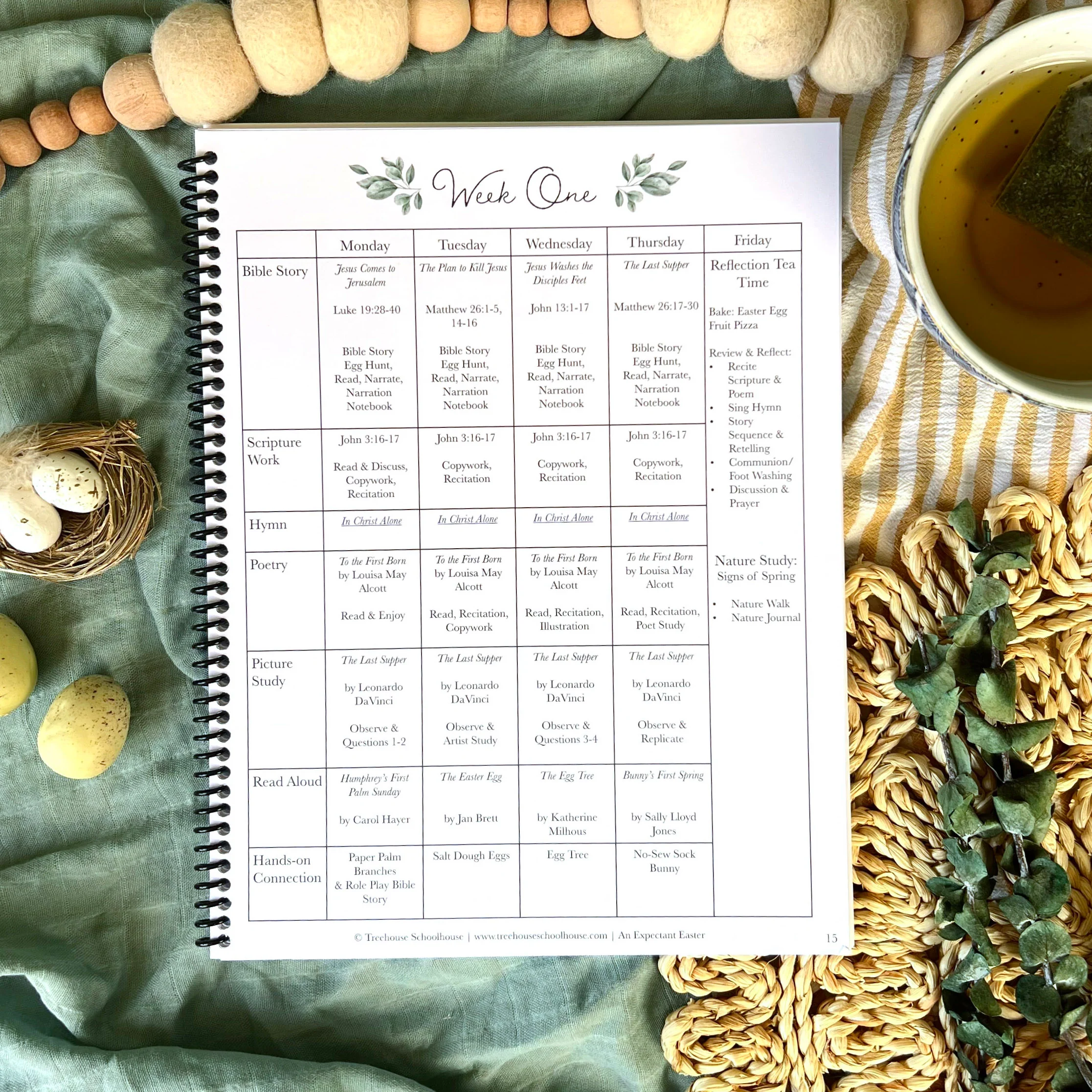 Each week your family will also memorize a passage of scripture, worship together with a hymn, enjoy a poem, and study a biblically-themed piece of artwork. Along with that, each day you will snuggle together and read an Easter-themed picture book and then enjoy a coordinating handcraft or baking project that reiterates a theme in the story. On Fridays, you will have a sweet time together over tea and a treat and reflect on all you have learned. You will also complete a gentle and engaging Spring-themed nature study.