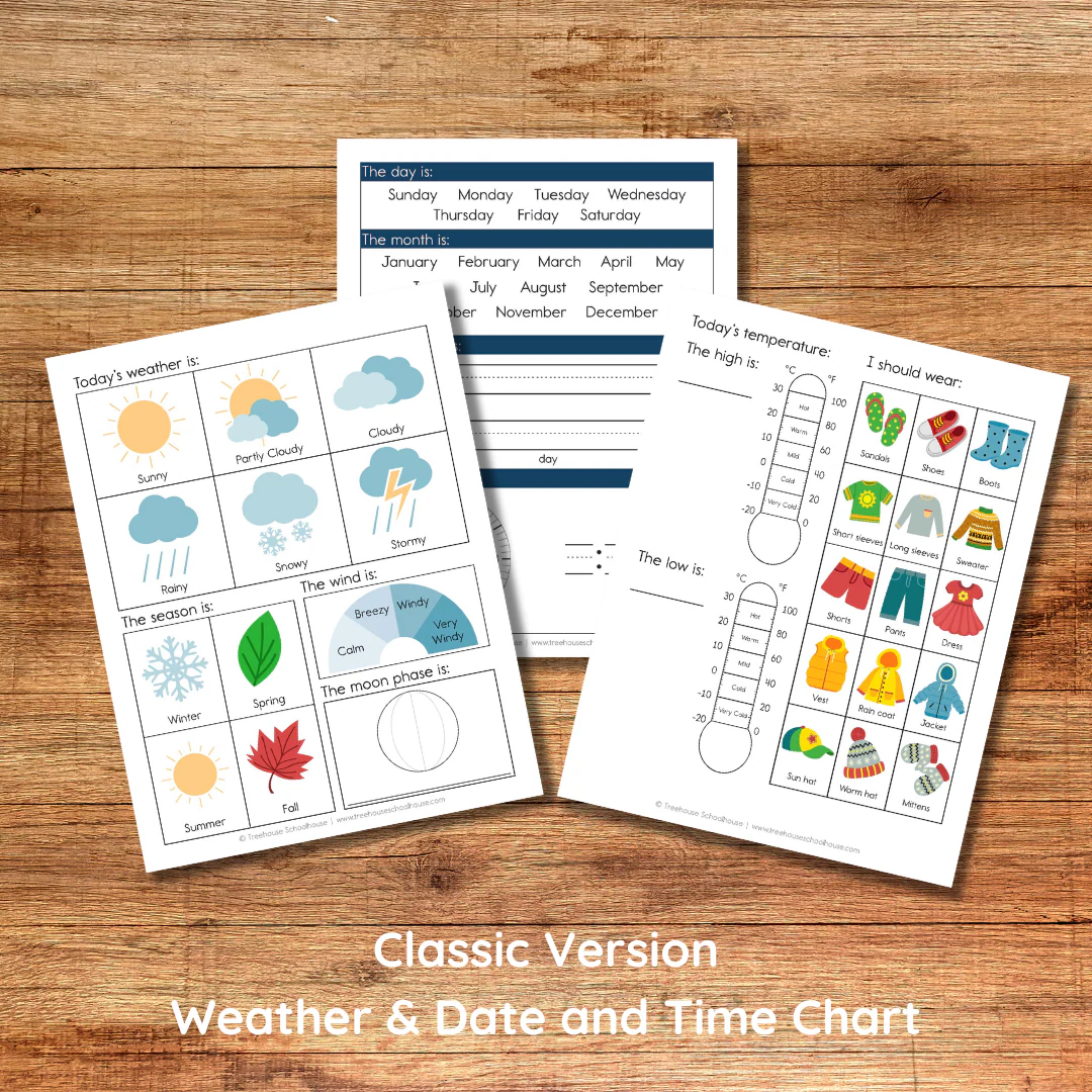 This interactive, reusable set focuses on weather, seasons, moon phase, temperature, weather-appropriate clothing, date and time, and reading a calendar. With this daily bundle, your child will practice the skills of handwriting, tracing, copywork, and telling time. We recommend you print these materials and place them inside of a Morning Time Menu or dry-erase sleeve. Using dry-erase markers, your child can fill this bundle out over and over again.