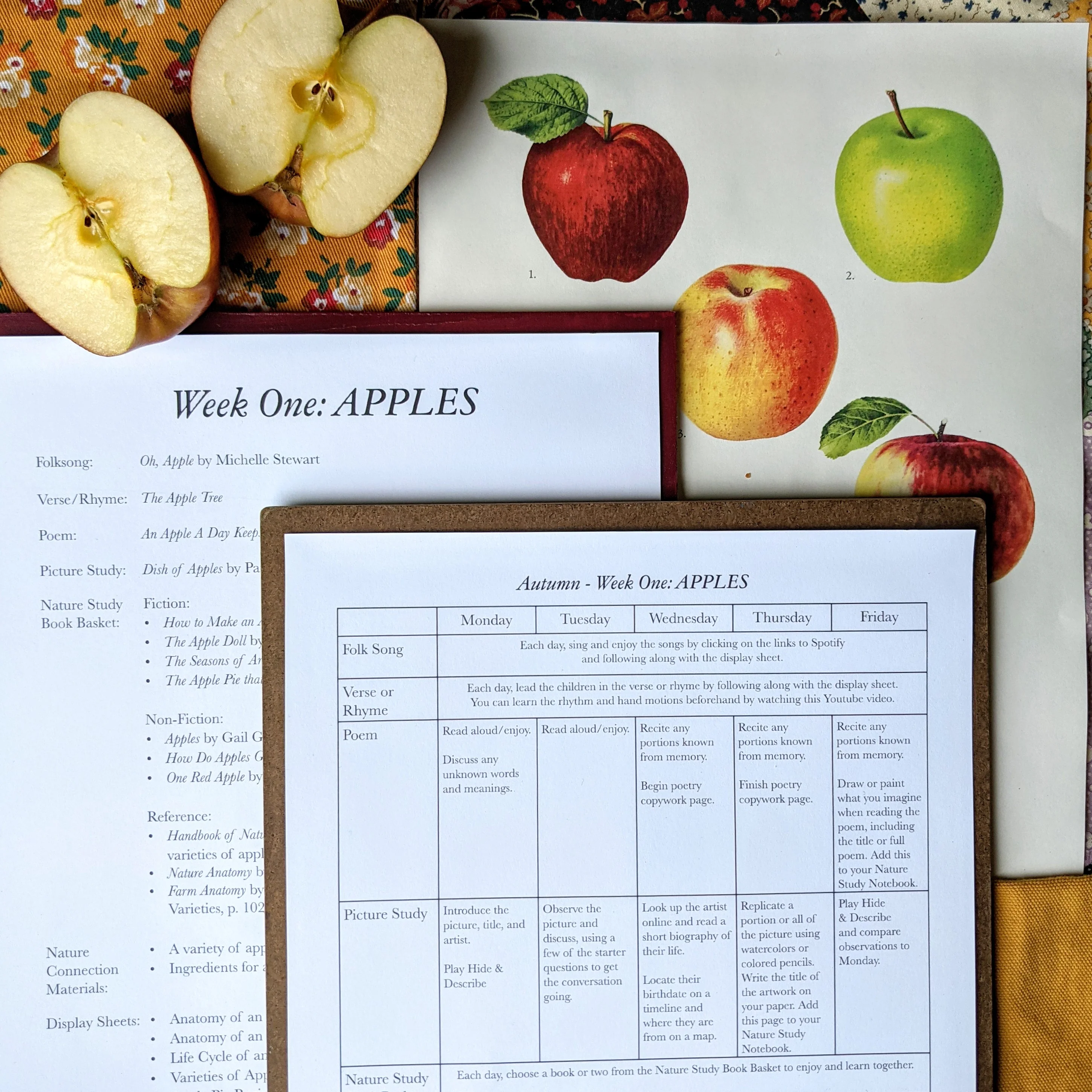 The Treehouse Nature Study Teacher's Guide is an overview with everything you need to guide your children through each day's nature study lesson. Each week of this 52-week study includes a weekly grid with daily lesson instructions making it easy to follow along. Each week has a themed folk song, hand rhyme, poem, and picture study. The daily lesson plans walk you through engaging with these beauty subjects in a new way each day. They also include links to Spotify and YouTube where you can listen to the folk songs together and learn the movements of the week's hand rhyme.